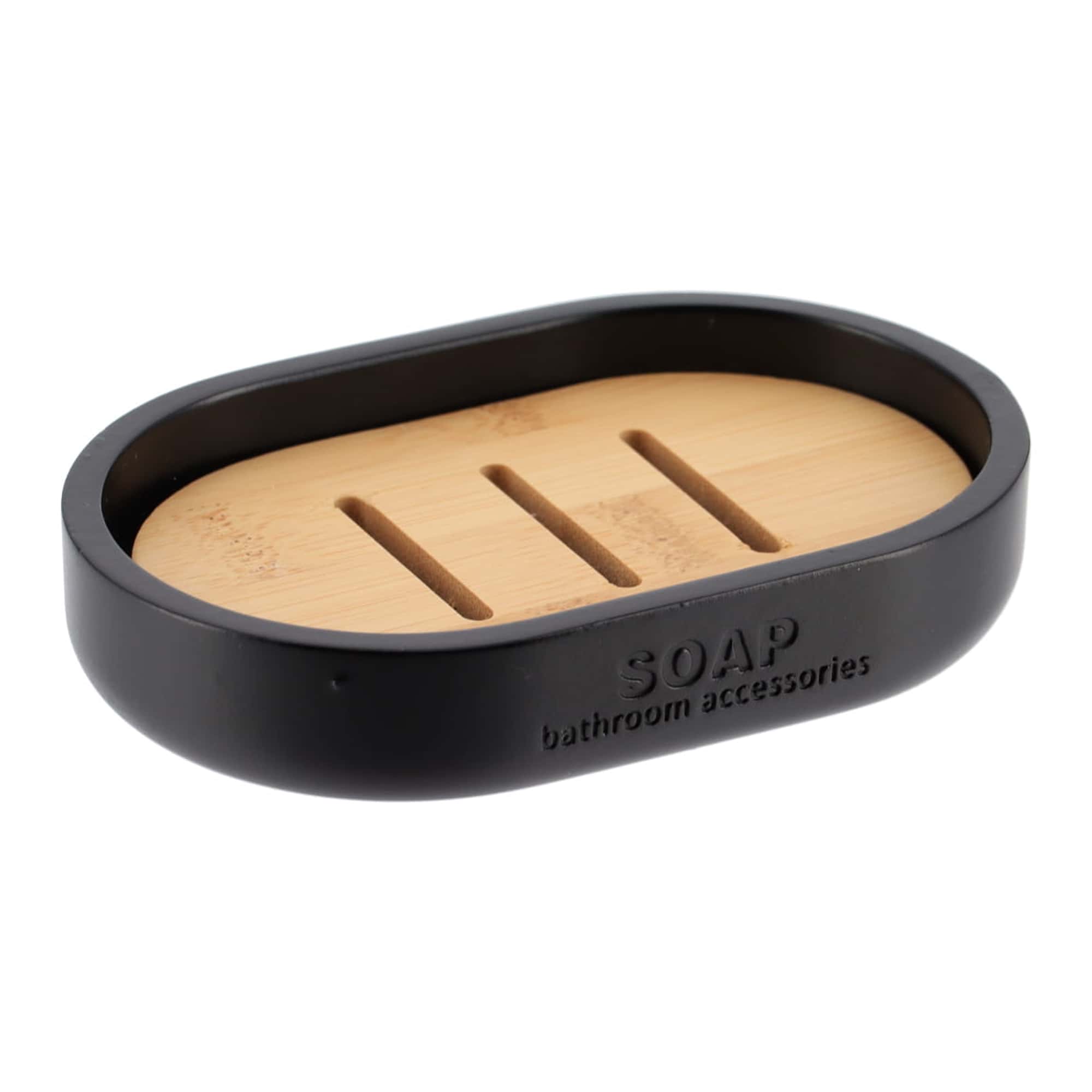Sleek Matte Black Soap Dish with Bamboo Base – Polyresin Soap Tray for Sophisticated Decor